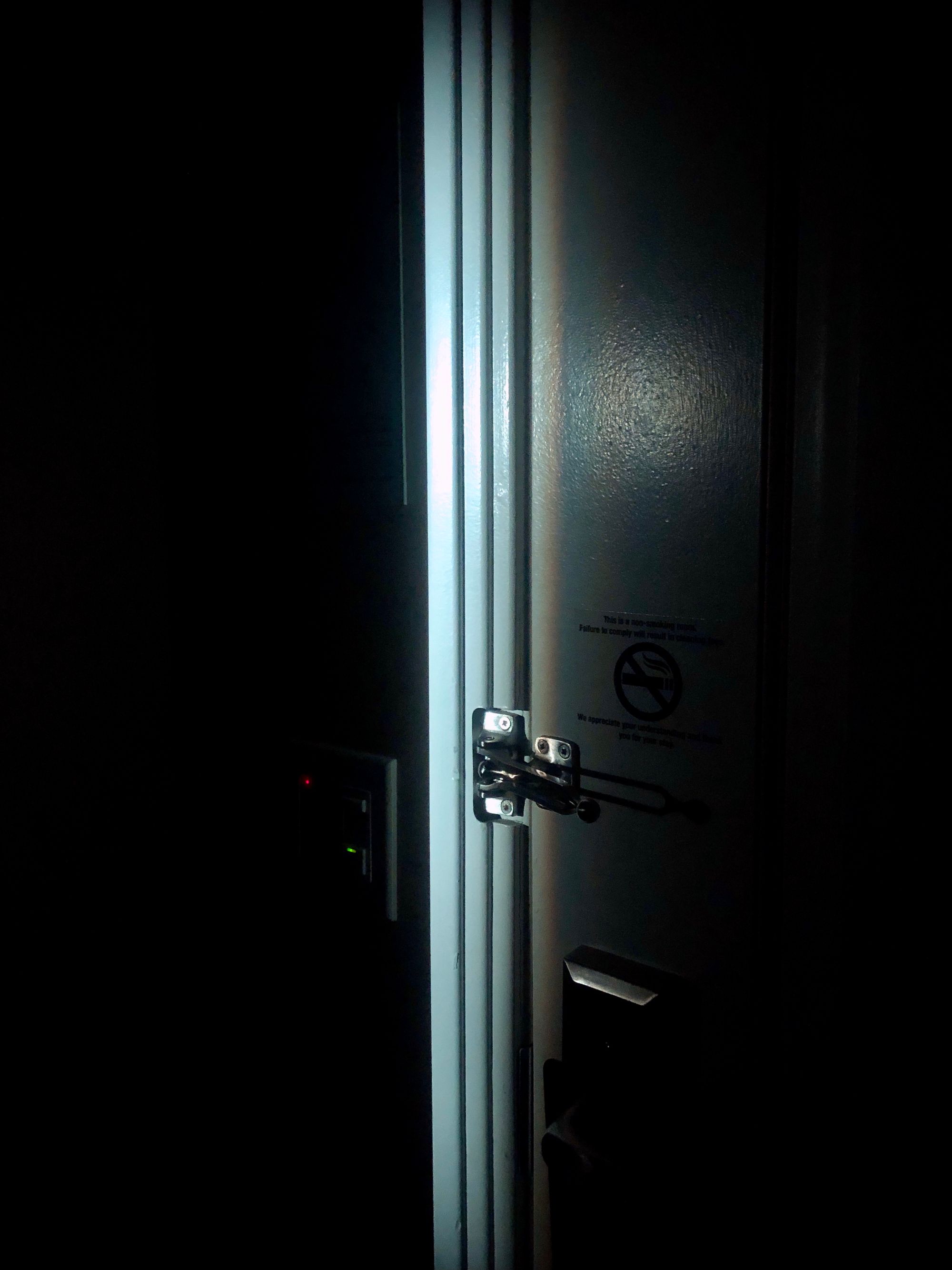 Before going to the front desk for a new key and a dose of late-night embarrassment, I decided to check the door on the other side of my room. Leaning in, holding my breath, I listened. Nothing.